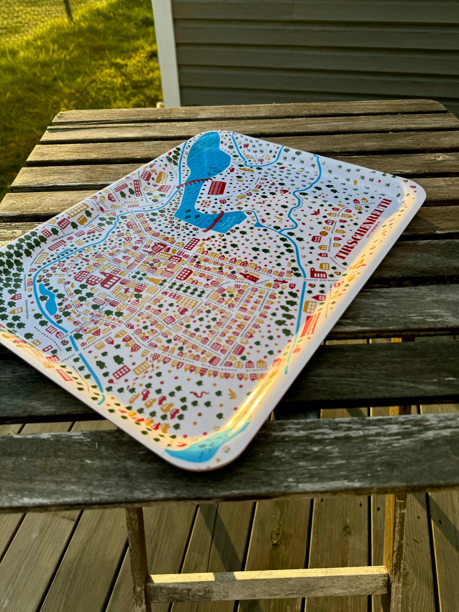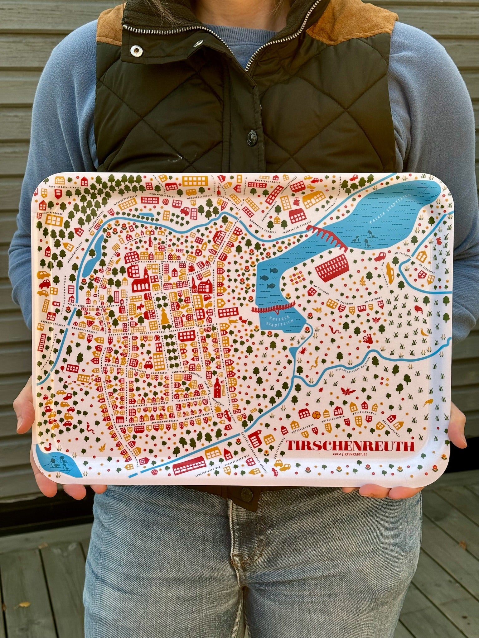 Dieses einzigartige Tablett mit der farbenfrohen Stadtkarte von Tirschenreuth in der Oberpfalz ist perfekt für den täglichen Gebrauch oder als besonderes Geschenk. Die lebendigen Farben und vielen Details bilden die Altstadt von Tirschenreuth, den Stadtteich sowie das Fischhof-Gelände ab. Damit ist das Tablett ein absoluter Blickfang.